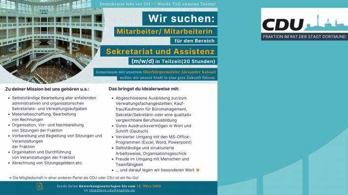 23.02.2026 Stellenausschreibung: Sekretariat und Assistenz (m/w/d) Die CDU-Fraktion im Rat der Stadt Dortmund sucht für die Fraktionsgeschäftsstelle zum nächstmöglichen Zeitpunkt eine/n...