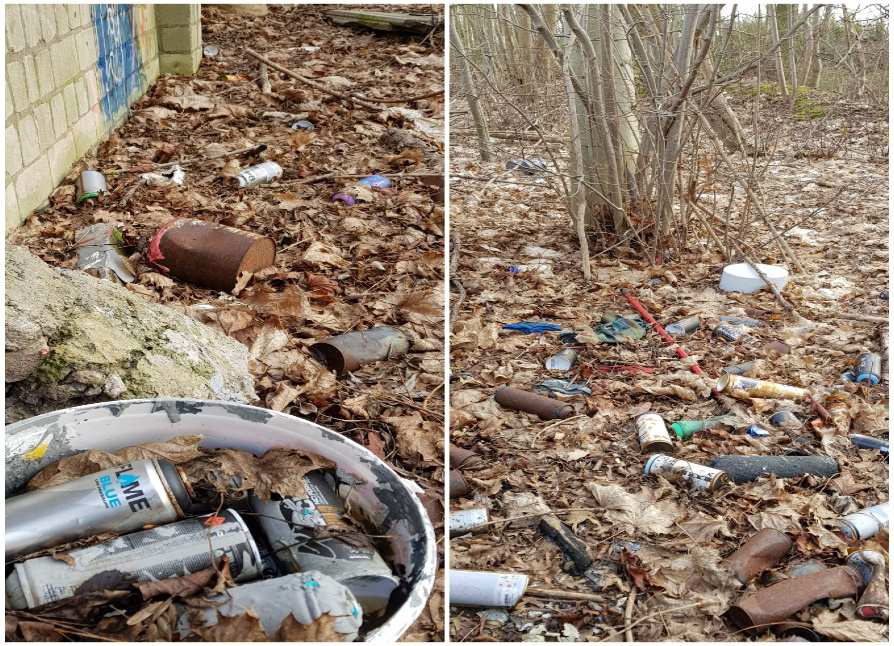 An der oben beschriebenen Stelle wird es Graffitikünstlern gestattet, die Begrenzungsmauer zu besprühen. Die dort bereits installierten Mülltonnen haben ein zu geringes Fassungsvermögen und sind durch die sperrigen leeren Sprühdosen schnell befüllt. Die weiteren Dosen werden dann sorglos über die Mauer in der Natur entsorgt (siehe Bilder).